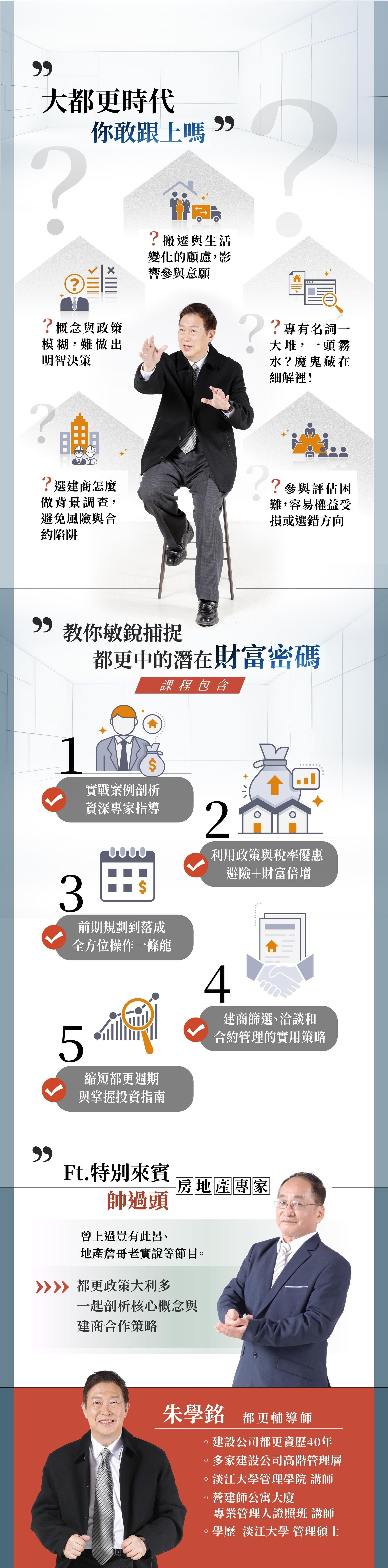 無論是從基礎的都更規劃,到深度解析房產市場,再到實際的投資技巧,三堂課程無縫接軌,