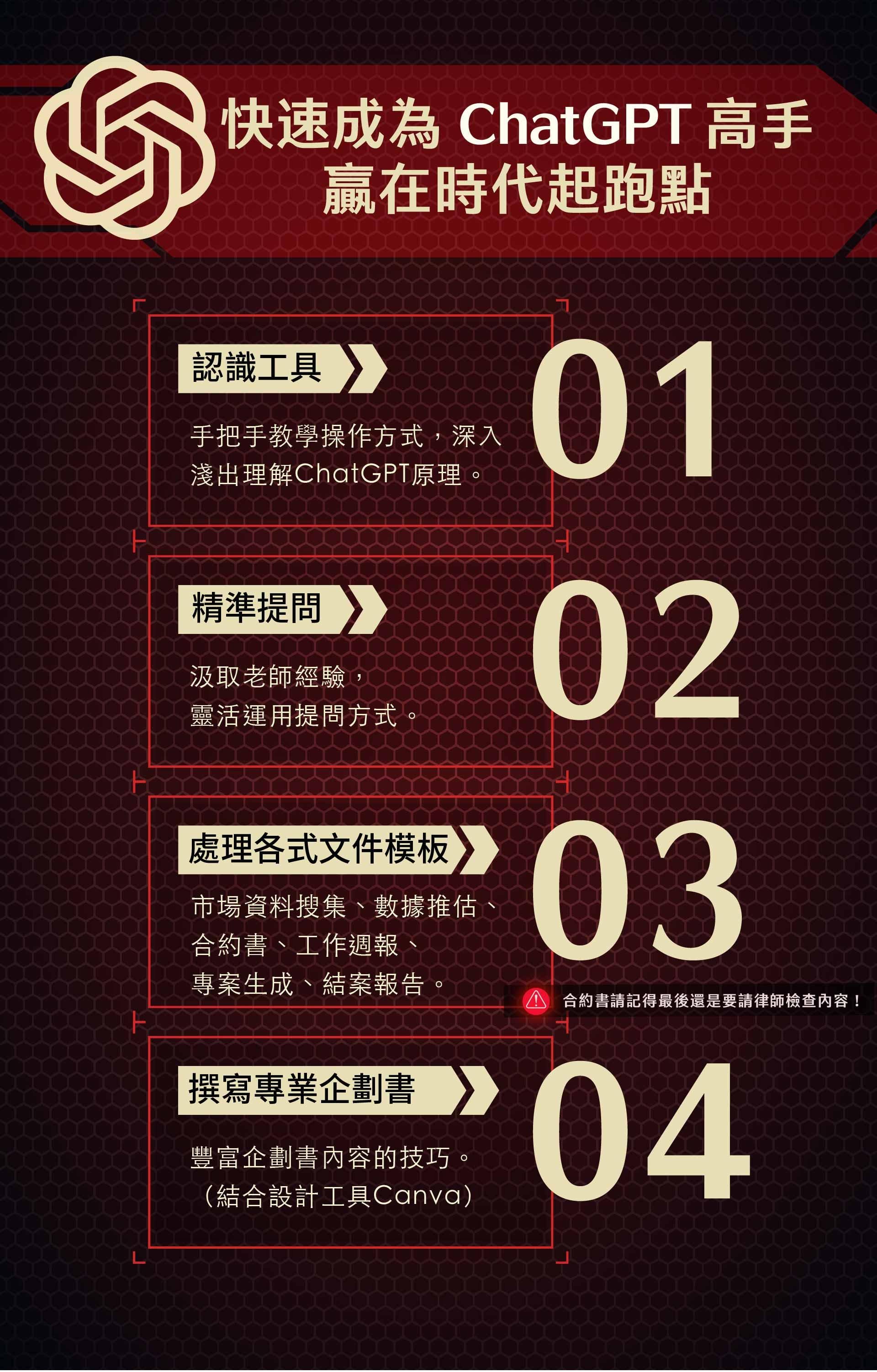 附贈最常使用的ChatGPT指令大全、Midjourney最新描述詞指令及企劃書模板。