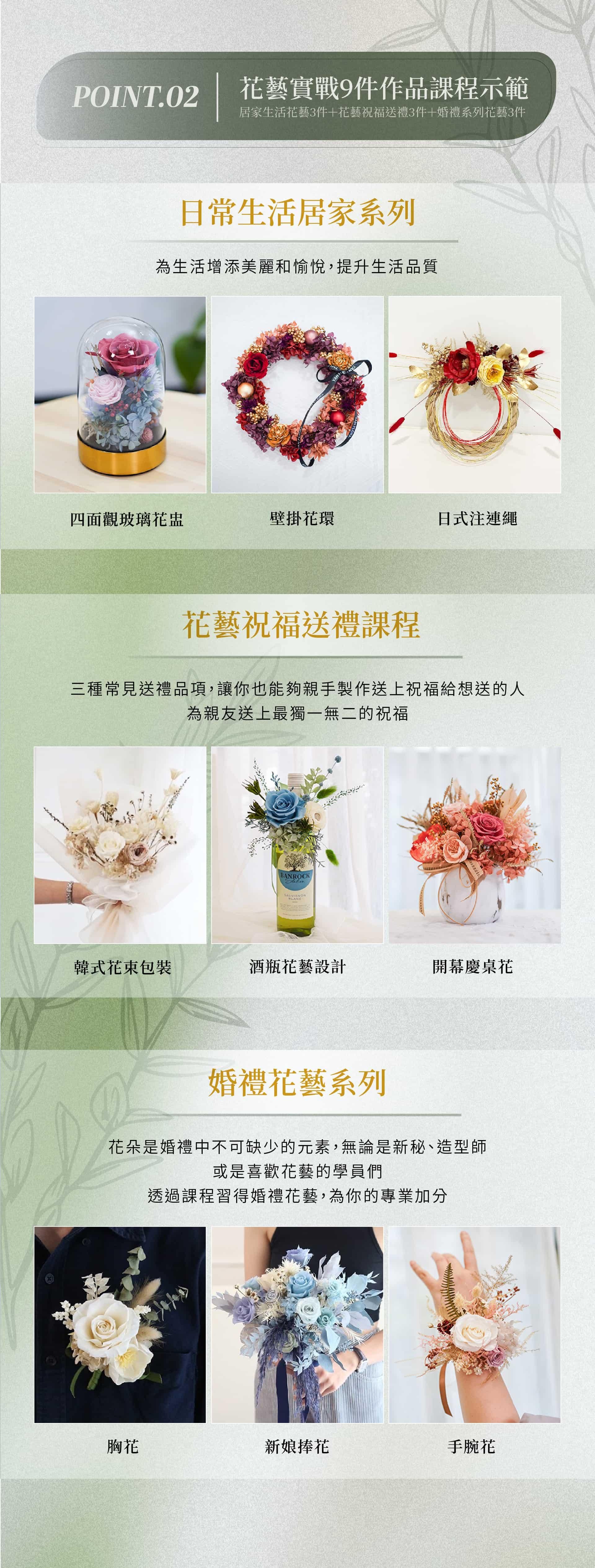 透過韓式花束、酒瓶花藝、永生花製作開幕慶桌花,傳達高質感、浪漫情感。學習者將透過這些花藝技巧表達心意與美好情感。