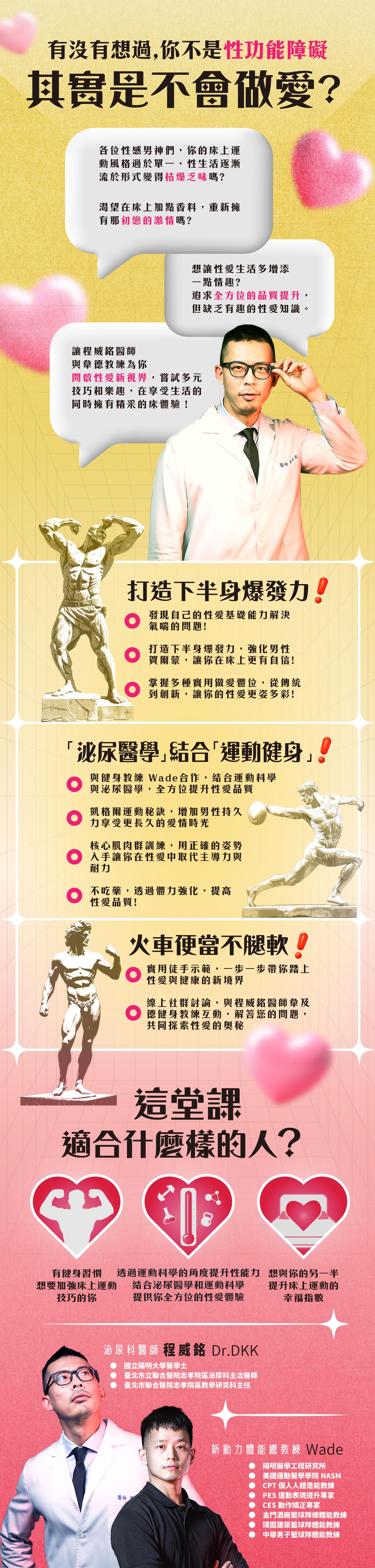 程威銘醫師的11講健康衛教課程,深入提升性愛體能與安全體位,結合營養指導,為成年人打造更健康、和諧的親密生活。